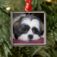 A Cute white and black Shih Tzu dog laying down on a rose / pink blanket. Adorable Shih Tzu Dog Breed Photograph image prints.
