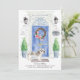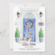Announce your new address with our stylish announcement featuring a Shih tzu , blue front door, welcome mat, slate sign, topiaries and a floral wreath set on a grey brick background.