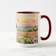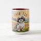 The outside of the mug features a beautiful illustration of a cute Shih Tzu puppy relaxing in a flowery field on a farm at sunrise.
