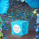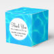 Wedding favour box (tiny size - 2 inch by 2 inch) with a photograph of clear blue pool water, with shimmering reflections. A white circle layered over top with your text inside.