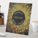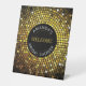 This pedestal sign features a circular pattern of shimmering gold-tone lights against rich black. Use as a welcome sign or informational sign for guests at a bridal shower, birthday party, anniversary celebration, holiday party or other special occasion. Available with matching products.