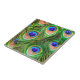 Decorative tile featuring an abstract close up of the beautiful shimmering eyespots on a peacock's train, highlighting the iridescent green, blue and bronze details of these tail feathers. Unique home and garden decor for bird and nature lovers. Photograph taken in Arcadia, California.