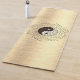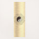 This stylish yoga mat has an ombre gold metallic brushed sheen resulting in a shimmery gradient backdrop where a mosaic pattern yin yang symbol with a delicate leafy wreath branching throughout the symbol creating elegant enchanting vibes.