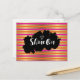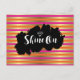 A cute postcard with an elegant pattern composed of pink, orange and gold (faux) metallic stripes. Layered over top is a black splotch which says "Shine On" in a fancy trendy font, with an illustration of a white diamond.