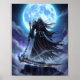 A striking sumi-e inspired illustration of a towering shinigami, captured in a dramatic low-angle view that emphasizes its overwhelming power and presence. This highly detailed and grungy Japanese ink-style artwork features dynamic black tattered robes with electric blue accents, a horned skeletal mask with glowing blue eyes, and a massive scythe. Set against a haunting sepia-toned textured moon, the background blends ink splatters, gestural brushwork, and a distressed grunge aesthetic. Perfect for dark fantasy art lovers, samurai-noir fans, and Japanese folklore enthusiasts. No text or symbols — just raw atmosphere and visual intensity.