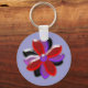This pretty keychain features a digital image of a daisy flower with purple, red and black coloured petals with a purple centre. The petals look like they are made of shining plastic that has caught the light and caused an iridescent effect. The background is a calming blue colour.