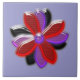 This awesome tile features a digital image of a daisy flower with purple, red and black coloured petals with a purple centre. The petals look like they are made of shining plastic that has caught the light and caused an iridescent effect. The background is a calming blue colour.