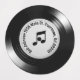 A classic shiny black vinyl record with a music note, name and address on a silver grey label.
