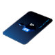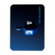 A modernistic, metallic blue dreidel against a dark, night-like background. Two of the Hebrew letters found on a dreidel, nun and shin, glow brightly. Add your own text.