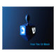 A modernistic, metallic blue dreidel against a dark, night-like background. Two of the Hebrew letters found on a dreidel, nun and shin, glow brightly. Add your own text.