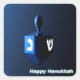 A modernistic, metallic blue dreidel against a dark, night-like background. Two of the Hebrew letters found on a dreidel, nun and shin, glow brightly. Text reading "Happy Hanukkah" also appears in glowing blue and white.
