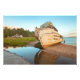 A weathered wooden ship lies partially submerged on a sandy beach at Point Reyes, its hull tilted at an angle. The ship's wooden planks are worn and faded, showing signs of age and exposure to the elements. The water surrounding the ship is calm and reflects the blue sky and the ship's silhouette. In the background, a line of trees and a few buildings are visible, suggesting a coastal town or village.