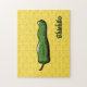 A green shishito chili pepper, also known as kkwari-gochu in Korean, is decorated with patterns inspired by Korean designs and sits on a yellow background with a smaller version of the same pattern and a script label in the corner. This mild pepper is eaten throughout Korea and Japan both raw and cooked.