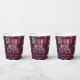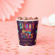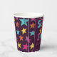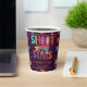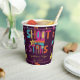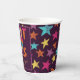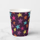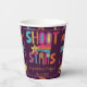Make your graduate feel like a star with personalized graduation party supplies. These paper cups feature the slogan SHOOT FOR THE STARS in brightly coloured painted style lettering against a dark purple background with your own custom congratulations message and class of year in yellow script style lettering. The rest of the cup has a pattern of colourful stars against a purple background.