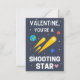 This cool Valentine's Day card features three shooting stars in space with the words, "Valentine, you're a shooting star". Stars, the Earth, and two other planets are in the background, and a pink heart floats in the bottom right hand corner. This card is great for kids who need to bring Valentines into the classroom. The back includes customizable text where you can add your child's name. Check out the collection for four more space-themed classroom cards.