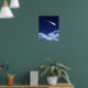 A poster of bright white shooting star flies across the dark night sky over a pillow of fluffy white clouds below.