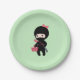 Cute cartoon ninja girl dressed in black but for a pink bow on top of her head mask. Traditional Japanese katana sword can be seen strapped to her back, it’s handle also coloured pink. The girl is holding a pink shopping basket.