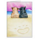 From Andie's original ink and coloured pencil painting: "Shore, They're Love Pugs". Depicts black and fawn Pugs watching the sunset on the beach a few steps from a paw print heart drawn in the sand. (c)2015 Andie.