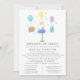 Baby "shower by mail" invitations for a girl or boy, with colourful rainbow sprinkle raindrops. Super cute smiling mailbox stands among the gifts and packages being delivered by gender neutral yellow, purple and green. Simple and sweet baby shower invitation idea for a shower themed virtual baby shower. Easily edit to include your party meeting information and gift mailing address.