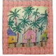 Presented as a paint-stroke image is this tropical cabin with tall palm trees reaching toward the sky, a mixed media work of art.