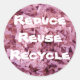 Promote YOUR message on this round sticker using the template text over the subtle pink shredded crinkled paper background or keep this environmental message or keep this environmental message.
