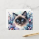 This floral feline postcard features a watercolor painting of a Siamese cat surrounded by beautiful blue and purple orchid flowers, with a pastel background. The blue-eyed kitty is looking off to the side while posed among the blue and purple exotic flowers.