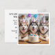 A really sweet invitation picturing 3 Siberian Huskies with a birthday cake and party hats, a great invitation for Husky and dog lovers.