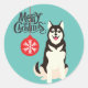 Smiling Siberian Husky Dog with red ornament and Merry Christmas text on aqua background