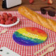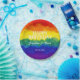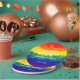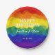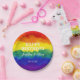 Joint birthday paper plate featuring a colourful rainbow background with vibrant typography.