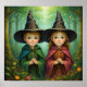 Two young witches stand side by side in an enchanted forest, wearing traditional witch attire. Each has a tall black pointed hat with a gold buckle and flowing cloaks - one in emerald green and one in burgundy red. The magical forest background glows with floating golden lights among the trees, while colourful wildflowers bloom at their feet. Finished as a watercolor art print.