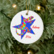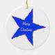 Whimsical Sidney Salamander looks like he enjoys swinging on this bright blue star. Fun colourful fanciful rendition design on keepsake Christmas ornament for kids and adults. All text may be personalized in template provided. Original art and design by Anura Design Studio.