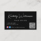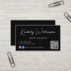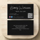 Chic black business card featuring your name or brand showcased in a stylish white signature script and business type in simple modern white lettering. Input your website address to create a QR code for customers and clients to scan for a list of your products, services, hours, etc., and add your instagram and facebook user ids for customers to follow you on social media. You can add additional information on the back or leave blank.