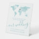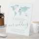 Turquoise Aqua Turquoise Blue Watercolor World Map Affiche de bienvenue Mariage pour un thème de voyage ou un mariage de destination qui est personnalisé avec votre lieu de réception, vos noms, et un coeur mobile marquant l'endroit de votre aventure, ville, plage, ou mariage île dans n'importe quel endroit du globe. Utilisez l'éditeur de modèle Zazzle avancé pour déplacer le coeur sur la carte, ou modifier les polices et la couleur arrière - plan pour correspondre à votre jeu de couleurs qui coordonne avec la carte fausse argentée détaillée des continents.