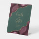 Un signe chic et élégant pour remercier les invités mariages à votre table Cartes et Cadeaux. Les mots "Cartes" et "Cadeaux" apparaissent dans la calligraphie de l'écriture manuscrite de couleur or, avec "merci !" ci-dessous dans la police serif. Des motifs d'agate d'aquarelle bourguignonne parés de faux parties scintillant doré encadrent le message en deux coins sur un arrière - plan vert émeraude. Voir notre collection pour la suite de faire-part de mariage et la papeterie de jour correspondant.