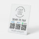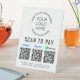 Simple panneau de piédestal de table pour votre entreprise avec les codes Venmo, Paypal et CashApp QR pour les clients à scanner pour les paiements mobiles sans contact. Ajoutez votre logo, vos codes QR, votre nom d'entreprise, votre numéro de téléphone et votre adresse de rue dans une simple typographie.