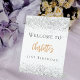 Un signe de bienvenue pour une fête d'anniversaire girly et glamour de 21e (ou tout âge). Un élégant arrière - plan blanc décoré de parties scintillant faux argentées brille. Personnalisez et ajoutez un nom et 21 ans. Texte noir et or.