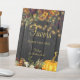Chute de plantes botaniques florales et de citrouille orange rouillé sur un bois de grange foncé avec des lampes à cordes mariage ou la douche nuptiale signe de faveur.