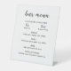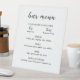 Ce panneau de bar mariage moderne est simple et minimaliste en noir et blanc. Il dit "open bar" en élégante caligraphie au sommet. En dessous, une section pour les boissons signature pour la mariée et le marié. Énumérez le cocktail sous son et le sien. Vous pouvez customiser son et le sien pour dire marié et marié ou dire leur nom. Ensuite, il y a des sections pour spiritueux, vin, bière et boissons non alcoolisées. Vous pouvez énumérer les marques exactes si vous le souhaitez ou le garder simple avec seulement le type de boisson. Les boissons non alcoolisées peuvent être renommées en cocktails Mocktails ou Vierges. N'hésitez pas à personnaliser entièrement chaque morceau de texte. Afficher sur la table ou le bar à la réception ou à la fête de mariage.