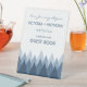 Ce panneau de piédestal est parfait pour tout couple qui planifie une fête mariage rustique dans les bois. Le design présente une gamme de forêts ombragées dans les tons bleus sur un arrière - plan blanc avec une formulation modifiable coordonnée couleur. Le design simple peut être personnalisé pour convenir à votre événement spécial et sera l'accessoire de table parfait pour toute fête à thème rustique, y compris : douches nuptiales, fiançailles, wedding showers, fêtes d'anniversaire et bien plus encore.