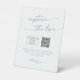 Cette ardoise boho chic bleu capture le signe mariage d'amour est parfait pour un mariage minimaliste. Le design bohème moderne, bleu et blanc pâle et poussiéreux, se compose d'une calligraphie rustique simple au style unique mais classique. Entrez votre adresse Web dans la section de code QR du modèle et le code QR sera automatiquement mis à jour et lié à votre site.