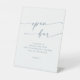 Ce panneau de mariage de bar ouvert en ardoise bleue et chic boho est parfait pour un mariage minimaliste. Le design bohème moderne, bleu et blanc pâle et poussiéreux, se compose d'une calligraphie rustique simple au style unique mais classique.