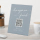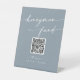 Ce guéridon chic et boho bleu mariage en lune de miel est parfait pour un mariage minimaliste. Le design moderne et bohème, bleu clair neutre, présente une calligraphie rustique simple, avec un style unique mais classique. Entrez votre adresse Web dans la section de code QR du modèle et le code QR sera automatiquement mis à jour et lié à votre site ou application. Personnalisez les panneaux avec vos noms.