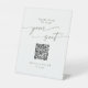 Ce guéridon à code QR chic boho vert et blanc est parfait pour un mariage minimaliste. Le design bohème moderne et neutre de sauge d'olivier vert et blanc présente une calligraphie rustique simple au style unique mais classique. Le panneau indique "s'il vous plaît scanner pour trouver votre siège". Entrez votre adresse Web dans la section de code QR du modèle et le code QR sera automatiquement mis à jour et lié à votre site. Personnalisez les panneaux avec vos noms et date mariage.