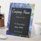 Bouquets d'hydrangées bleu violet en vases bleu cobalt encadrent l'espace parfaitement placé pour vos informations personnalisées qui feront une belle déclaration inoubliable pour votre entreprise ou entreprise.