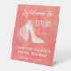 Bridal Shower party sign features elegant white high heel Bride to be wedding with pink peach background.