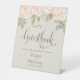 Panneau de table d'hôtes mariage. avec de belles fleurs aquarelles, belle calligraphie script avec fleurs romantiques minimalistes, et feuilles dans des couleurs roses poussiéreuses. Une façon élégante et moderne de décorer vos panneaux de table mariages.