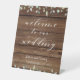 Arrière - plan rustique de planche à grange avec aquarelle de la végétation eucalyptus le long du haut et du bas avec un script de calligraphie de police swash cursive accueillant les invités à votre mariage avec vos noms et date mariage.