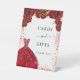 Un panneau pour les cartes et les cadeaux. Un fond blanc avec des paillettes fausses rouges, une robe rouge et des roses rouges, des fleurs.