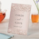 Un fond en or rose faux avec des confettis. Avec le texte : Cartes et Cadeaux. Merci !