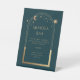 Celestial Green Gold Mimosa Bar Sun Moon Stars Astronomie Celestial Cosmic Galaxy Espace Anniversaire Événement Piédestal Panneau Tabletop Signaler présente un cadre doré, lune et étoiles sur un arrière - plan vert forêt. À l'intérieur, il y a votre texte personnalisé. Conçu pour vous par ©2024 Evco Studio www.zazzle.com/store/evcostudio